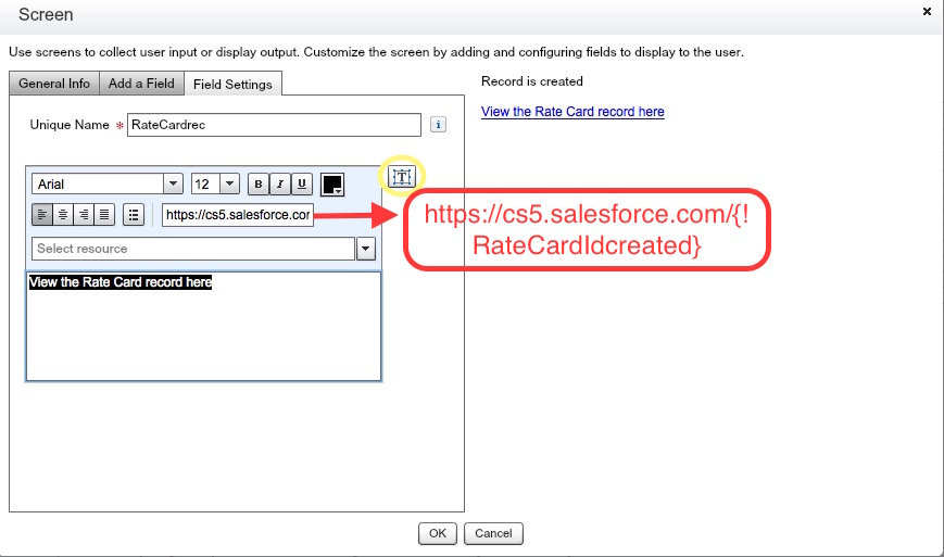 For example, there is a flow which gets inputs from user and creates a RateCard(Custom object) record, if it doesn’t exist in the system. Once created, it should show the URL(clickable) of the record created.